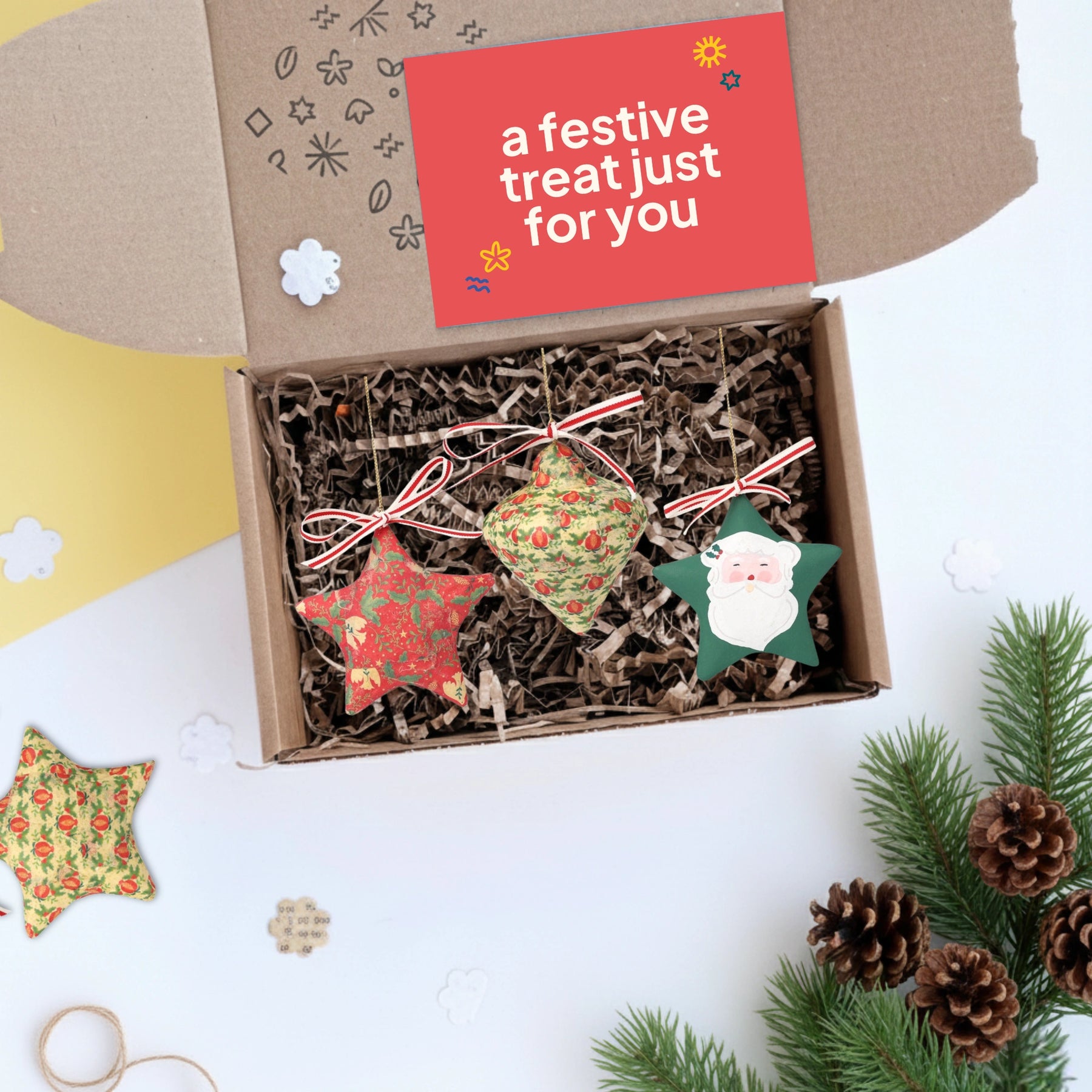 Each gift box includes three different handmade decorations from a selection of six styles with a gift card explaining the story of how they were made.