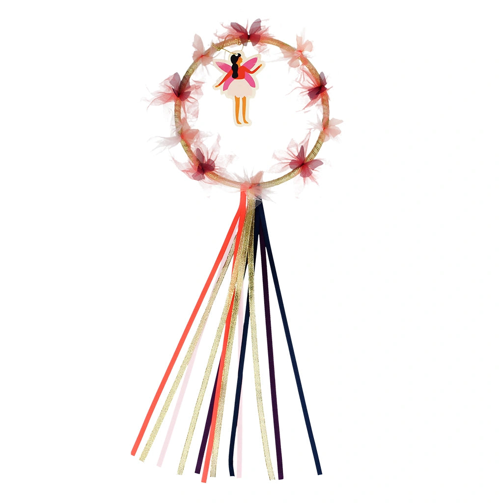 For a complete fairy transformation, pair this garland crown with our variety of matching Fairies in the Garden accessories, such as shimmering fairy wings, temporary tattoos,nail art and and magical wands, creating an unforgettable ensemble!