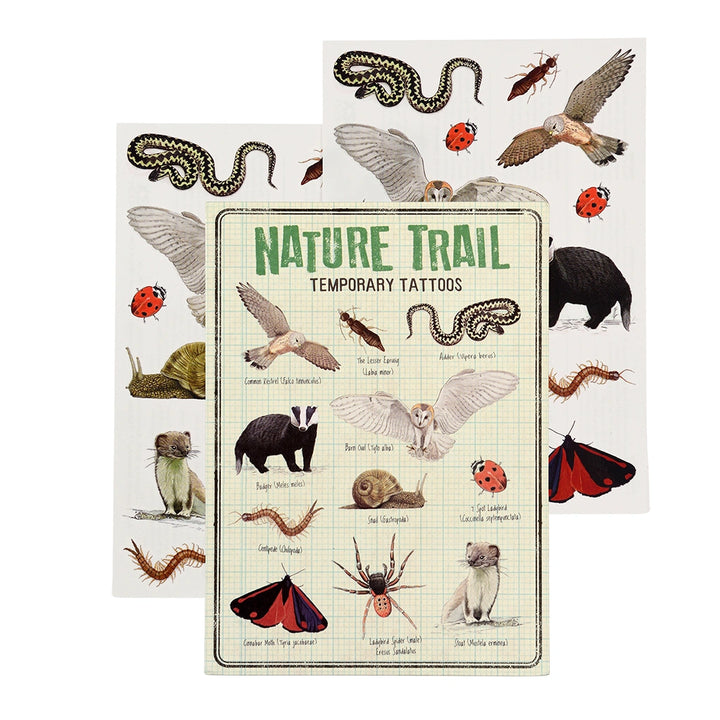 Nature trail temporary tattoos for children aged 3 and over. The tattoos feature butterflies, bugs and British wildlife.