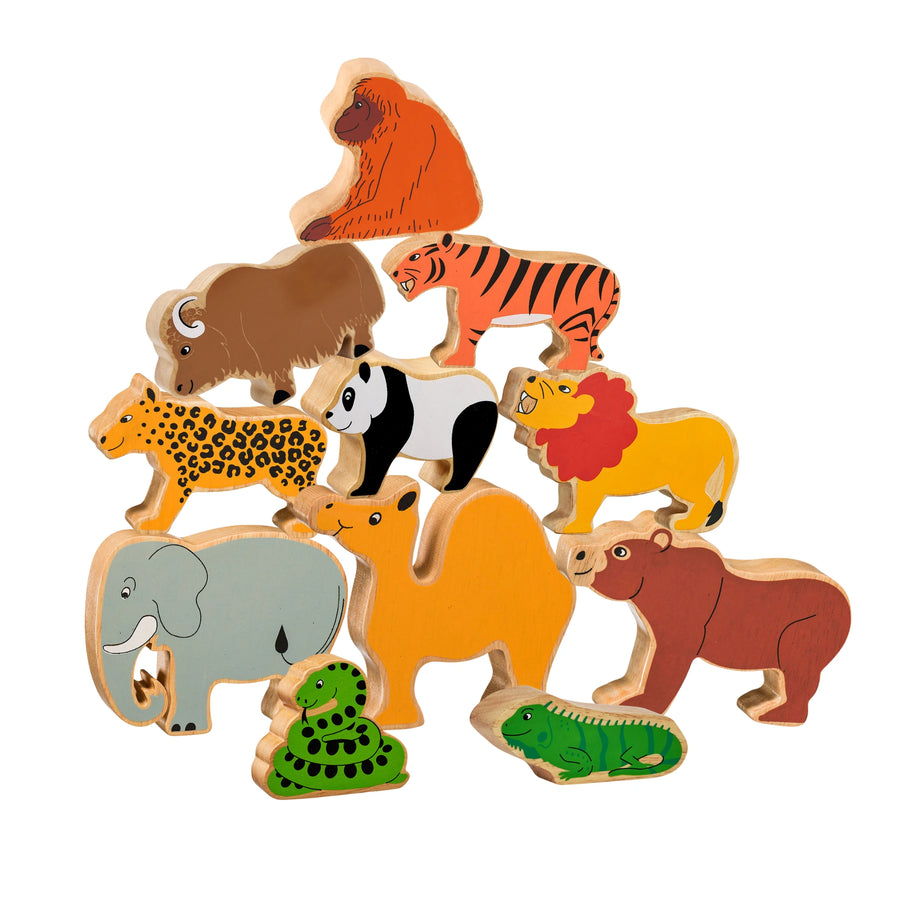 Discover a magnificent array of native creatures: a powerful tiger (roaming the jungles and grasslands of India and Southeast Asia), a slithering snake (found in diverse habitats across the continent), a majestic elephant (from the forests and plains of India and Thailand), a versatile bear (like the black bear in forests or sloth bear in India), a regal lion (found in the Gir Forest of India), an elusive leopard and snow leopard (spanning various Asian habitats), a wise orangutan (swinging through the rainforests of Borneo and Sumatra), a beloved panda and red panda (munching bamboo in the mountains of China), a hardy camel (crossing the deserts of the Middle East and Central Asia), a fascinating iguana (basking in tropical regions), a resilient yak (living in the high Himalayas) and the most magnificent peacock!. Each animal is beautifully printed on both sides with a colourful design, showcasing the appealing natural wood grain edge for wonderful tactile play.