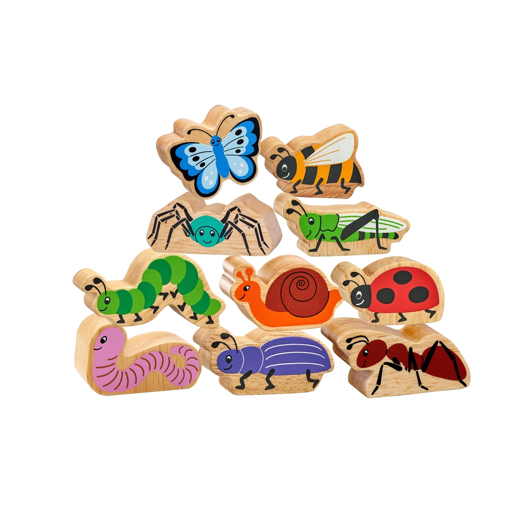 This minibeast playset includes a ladybird, bee, ant, caterpillar, butterfly, beetle, worm, grasshopper, spider and snail. Each minibeast is printed on both sides with a colourful design, showcasing the beautiful natural wood grain edge and providing tactile engagement.